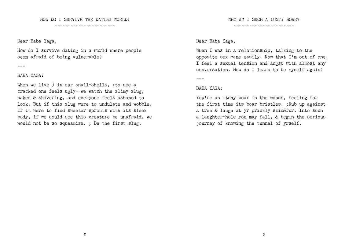 With a strange, otherworldly style, poetic clarity, and striking honesty, Ask Baba Yaga contains beautifully skewed wisdom to be consulted in times of need.