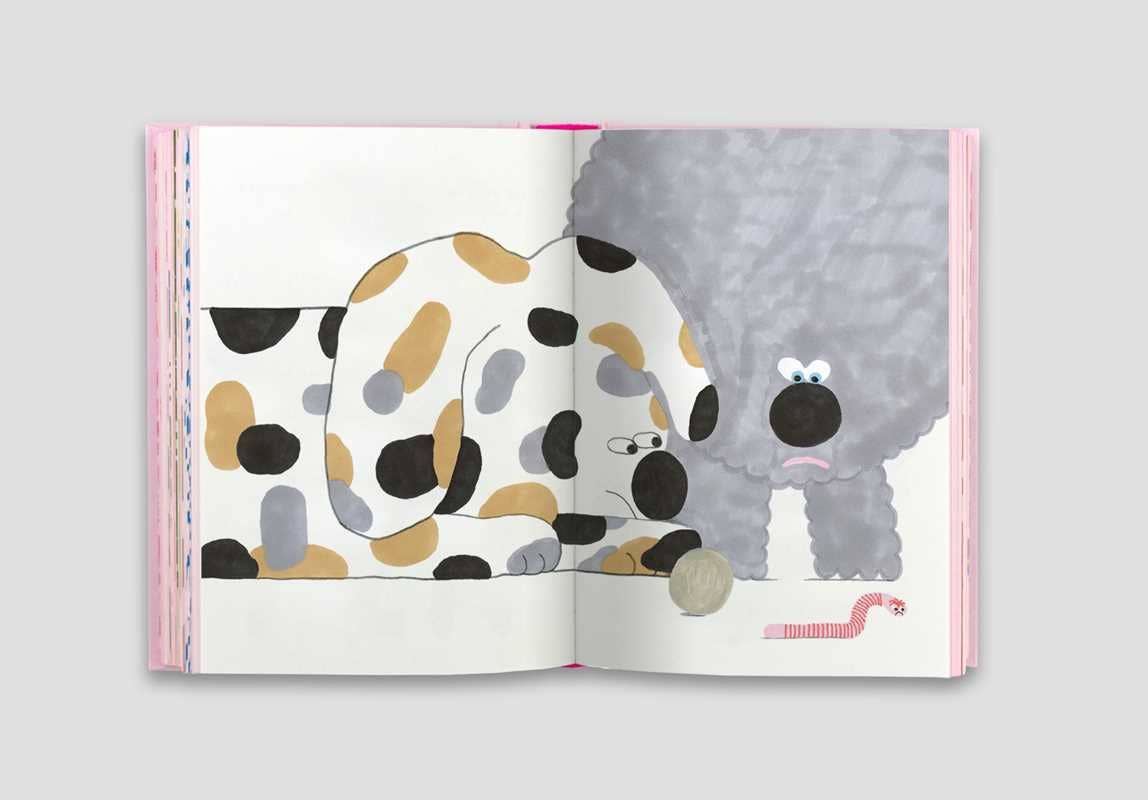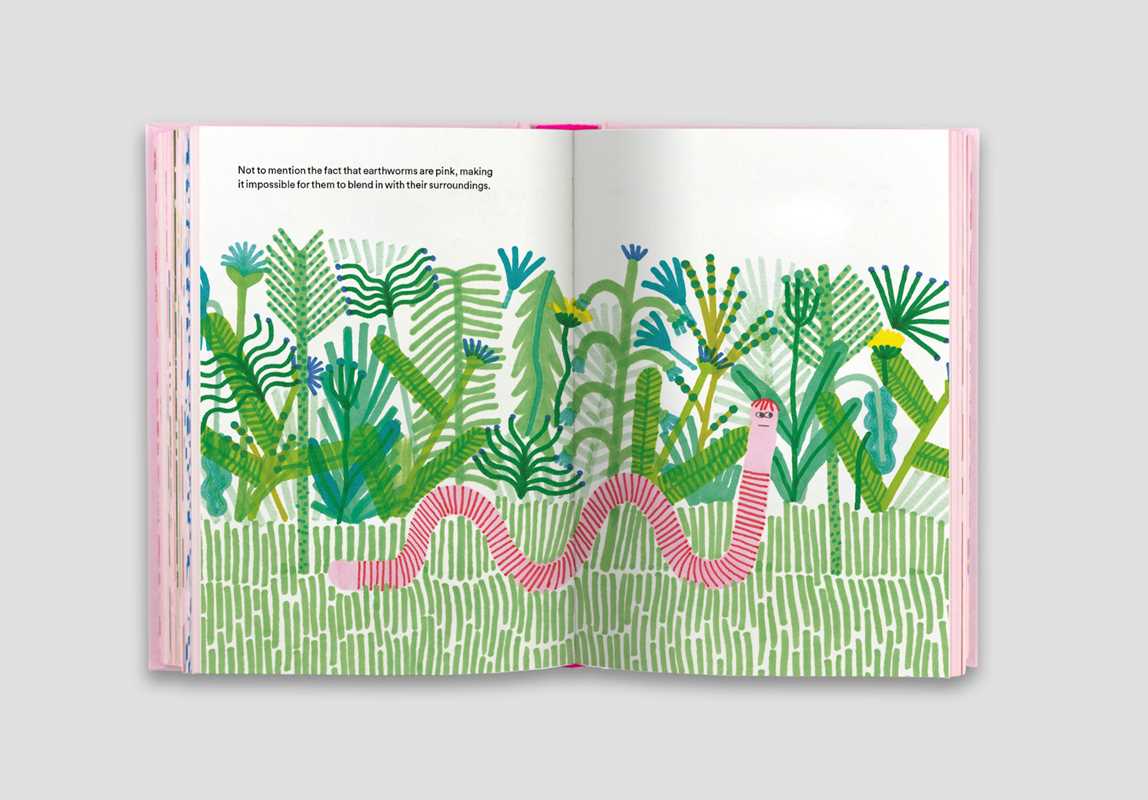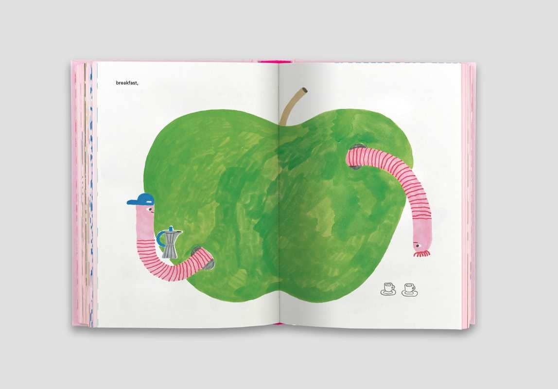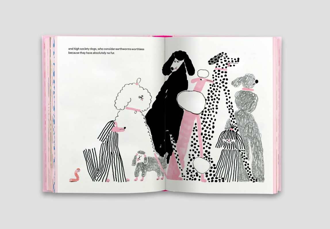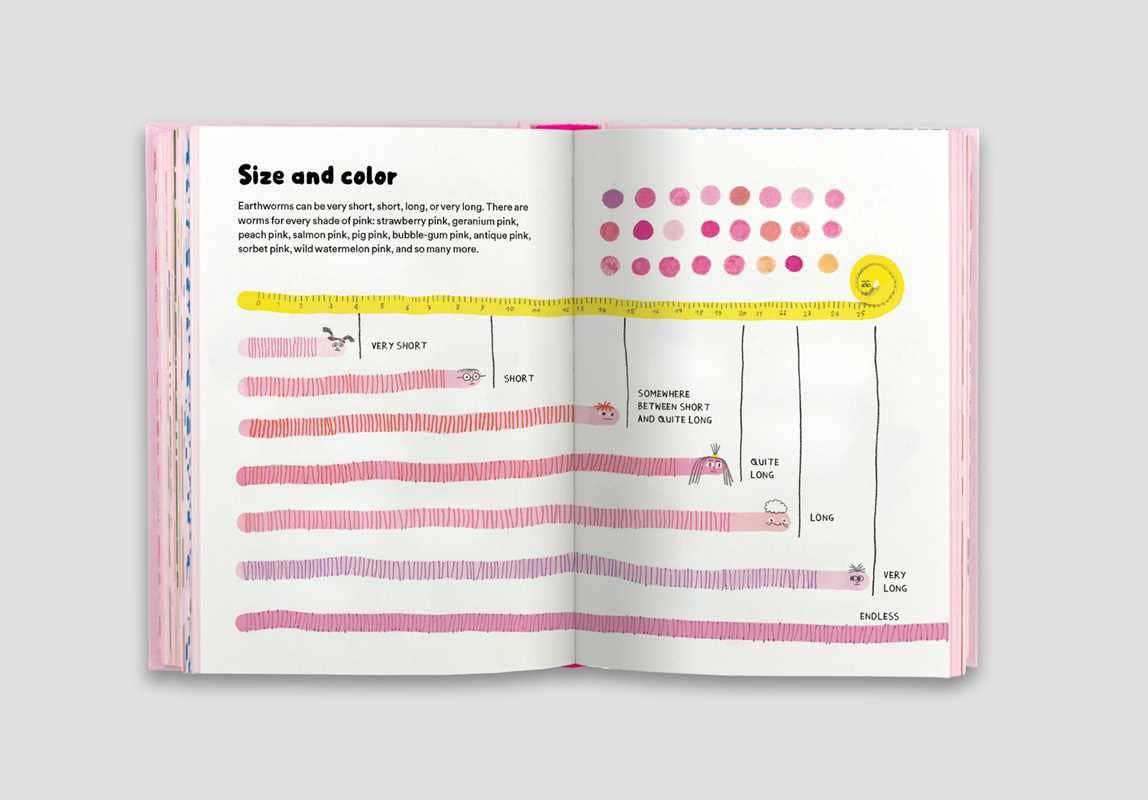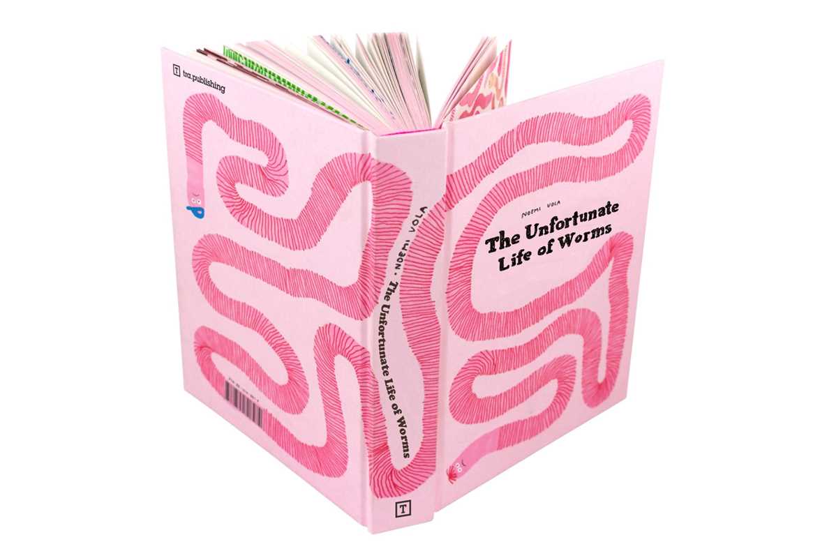 Beginning with “factual” material about worms in general, from eating habits to underground habitats to its varying shades of pink, there is much to discover about worms. The narrative then follows one worm in particular through a tragic loss of its better half (also known as the worm’s tail), becoming a metaphor for all who have loved and lost. The humor of both illustrations and text are paired beautifully, introducing a distinctive new artist with honed literary sensibility to the American audience. Vola’s pink-edged bible of worms
